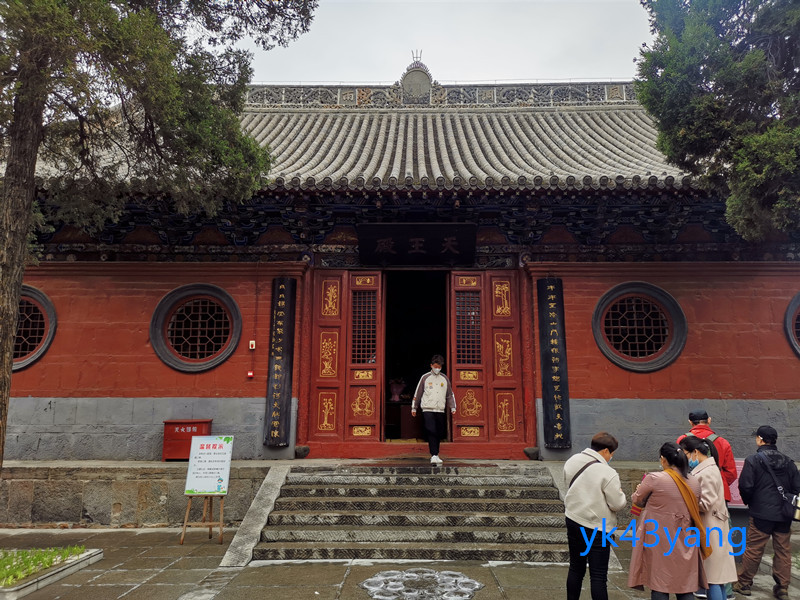 回到了中轴线上的天王殿。天王殿面阔五间,单檐歇山顶。大门上方的横匾为“天王殿”,两边的楹联题曰:“年年空冷山门,接张待李,总见他欢天喜地;日日携空布袋,少米无钱,却剩得大肚宽怀。”读来甚感意味深长。据介绍,天王殿内供奉的弥勒佛像为明代的“干漆夹苎”造像,而干漆夹苎技术现在已经失传。令人 不解的是,白马寺几经毁灭,何来明代佛像?想来大概是后来从别处请回来的佛像吧。