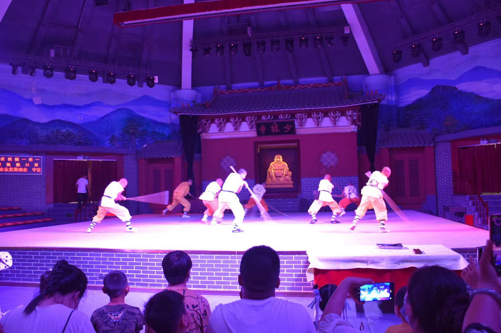 武术表演:看完常住院出来,到乘车点坐电瓶车出,跟司机说要去看表演,司机就在半路放我们下来,走过去武术馆。这里的商业味就很浓了。进出口有不少旅游纪念品店,开演前先卖几幅字画,找了个人现场书写。表演的都是年轻人,按说也不应该是真和尚(这年头要当上有编制有工资的和尚怕是不容易,再加上未成年人保护,我猜应该不会允许小朋友当和尚的),纯任务式表演,技艺谈不上精湛吧,毕竟现在电视表演节日随便可以见到更高质量的。只不过来了少林寺要不看点武术节目说不过去。只是觉得粗糙的表演不知道会不会影响少林寺的形象?虽说他们可能跟实际上跟真正的少林寺没啥关系,只是跟景区有关系,或许也就只是租在这做纯商业表演。表演完演员们还出现在游客出口的广场上,像是在等人合照,不知要不要收费,让人联想去泰国看什么表演后的操作。