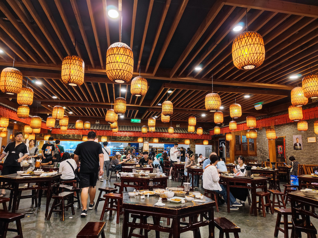 小街天府:用足政策拖到14点才退房,退房后把行李存在前台,再去西工小街吃个午饭。本想打个车去的,可的士司机说就走过去两个街口就到了,不必打车,拒载了。只好走过去,真的没多远,就在周王城广场东边。这也是条出名的食街,我们是冲着其中的小街天府去的,很大的一家小吃餐厅,古色古香,像是把各种街头小吃都集中进店来了,价钱不贵,吃客很多,得先扫码下单,拿着打印出来的小票自己去不同的窗口取,不说很好,但有特色。