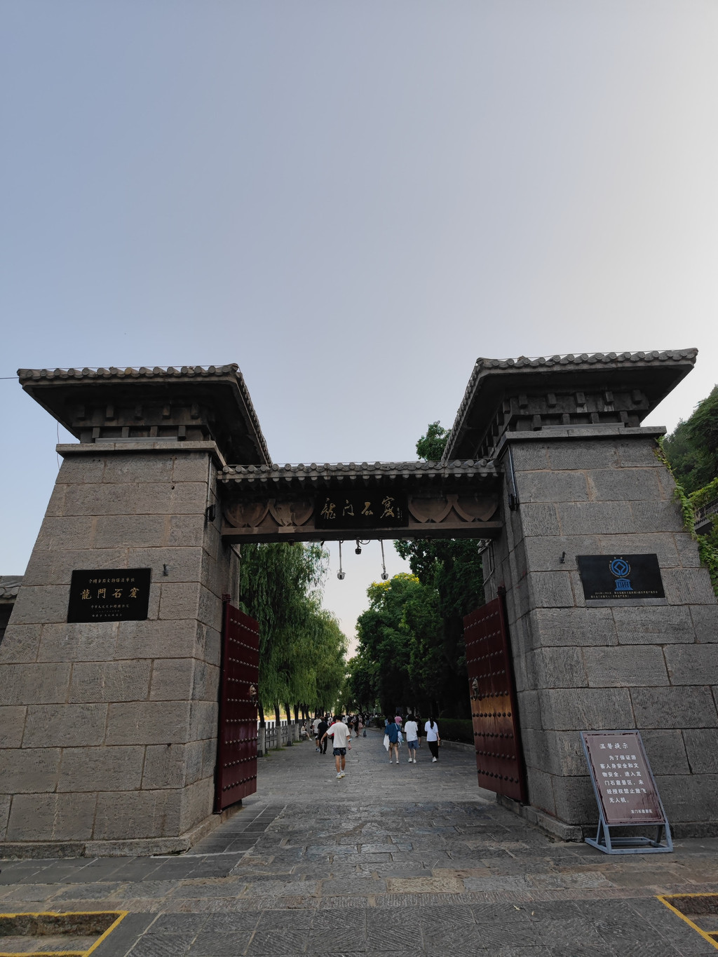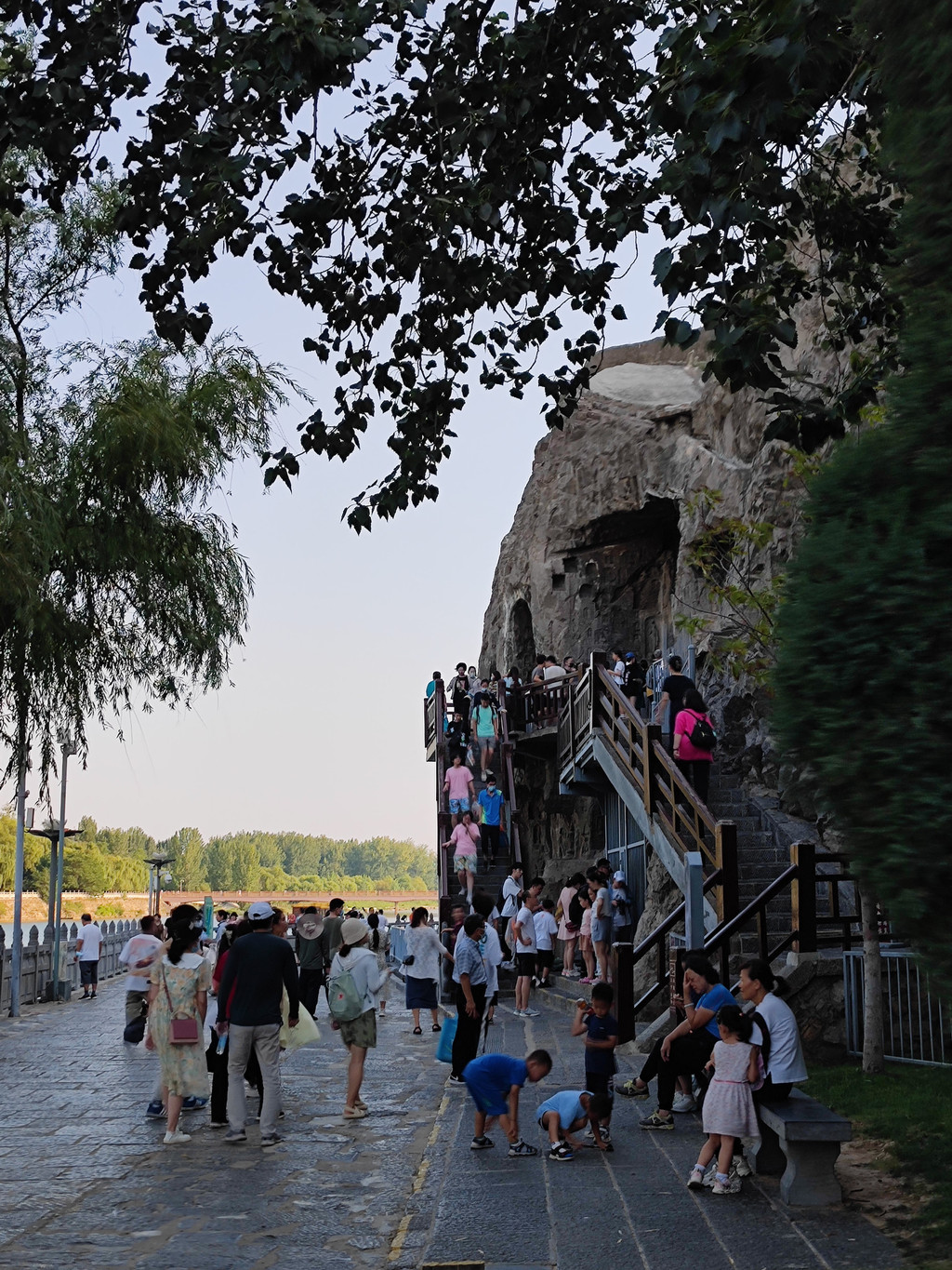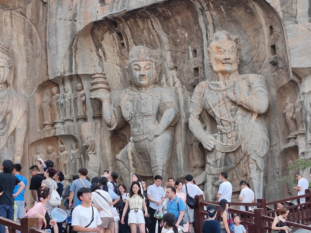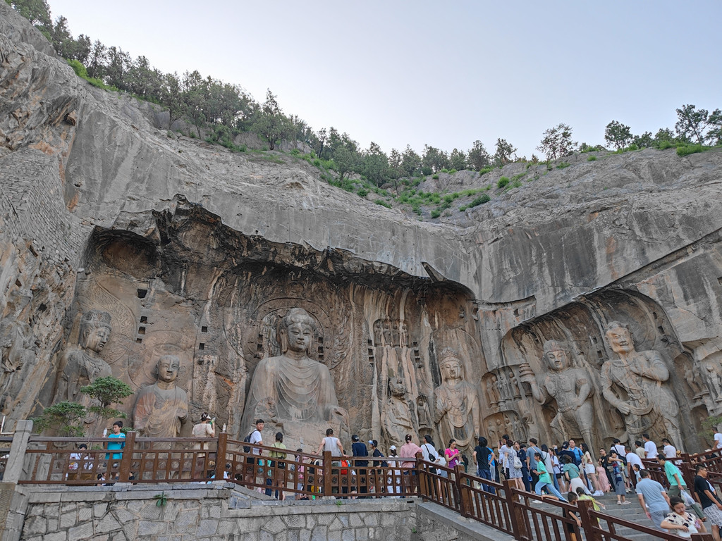 龙门石窟:从酒店去石窟西北服务区没多远,一路走过去就可以,景区外其实也是一个公园,种着不少桃树,果实累累了。有电瓶车可坐,进去时似乎没太必要。我们下午5点才去看石窟,也许早点去更好,但更热。请了人工讲解,官方的,很抢手,人手不足时还得排队等。5个人以内200元,超出1人加10块。会配有耳机,确保每一个都能听到。讲解非常专业且有趣,介绍了许多石窟的来龙去脉、历史变迁,引导看了许多大小雕像的细节,解释了变化和保护的设计和原理等等。看古窟还是需要讲解,否则就只能是拍照打卡了。石窟从北魏开始开凿,盛于唐代,分布在伊河(这一段应该是由北向南流)两岸的山上,重点看的是西山(龙门山)部分,讲解也只讲这部分。最大的一尊佛像卢舍那佛像也在西山上,据说是按照武则天相貌雕刻的。讲解到此为此,然后过桥到河对岸,这边叫香山,应该也有些石窟,似乎在修,反正我们也没精力再去看了。山上有香山寺,这个时间点(晚上7点了),可能也关门了,否则居高临下全景视野应该很好。河边正对着对面的卢舍那大佛有个观景台,据说晚上灯光下的石窟效果壮观,但当时才晚上7点多,天还是亮的,可能是8点亮灯吧,人困马乏,不等了。沿河走到下一座桥边,会看到旁边有白居易的墓园(白园),但6点已经关门了。看来游石窟得早点来,或许一大清早来更好。