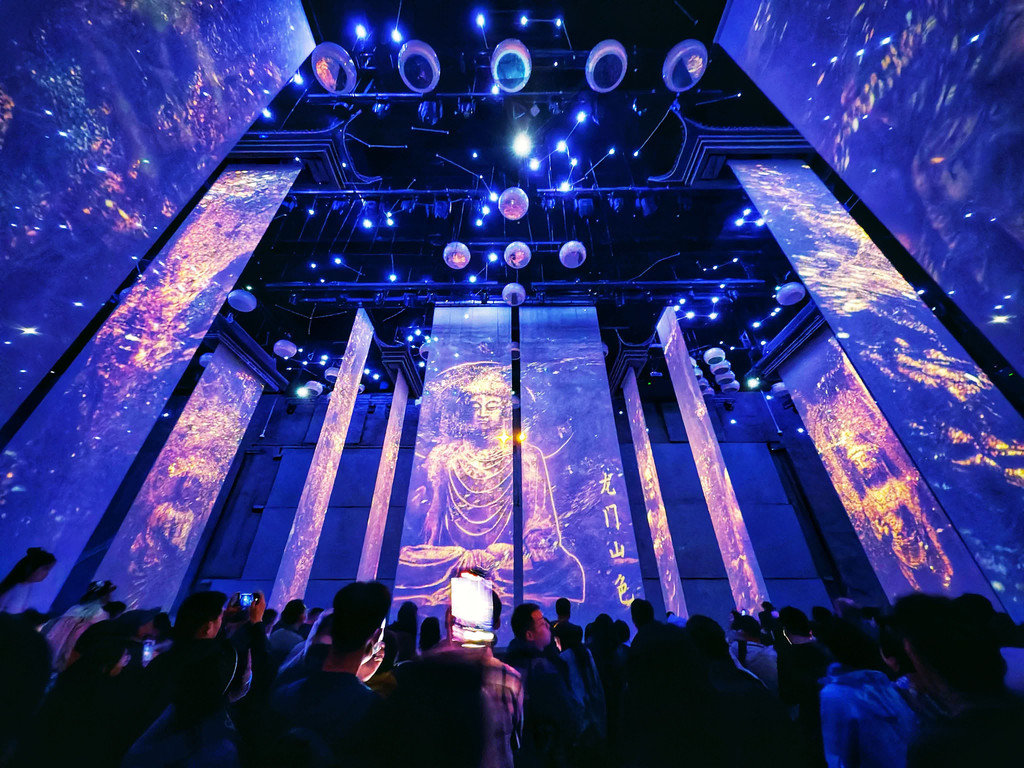 这个就是我强烈想要给大家推荐的,中国首部数字行浸演艺《寻迹洛神赋》,以洛阳神韵为精神符号,以河洛文化为创作蓝本,用科技艺术讲述洛阳故事,将千古神都的精华装载其中,开创了国内首个展、演、秀融合的演艺形态,利用数字科技赋能文化演艺,带你开启一场关于洛阳的千年寻迹之旅。