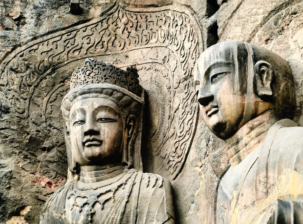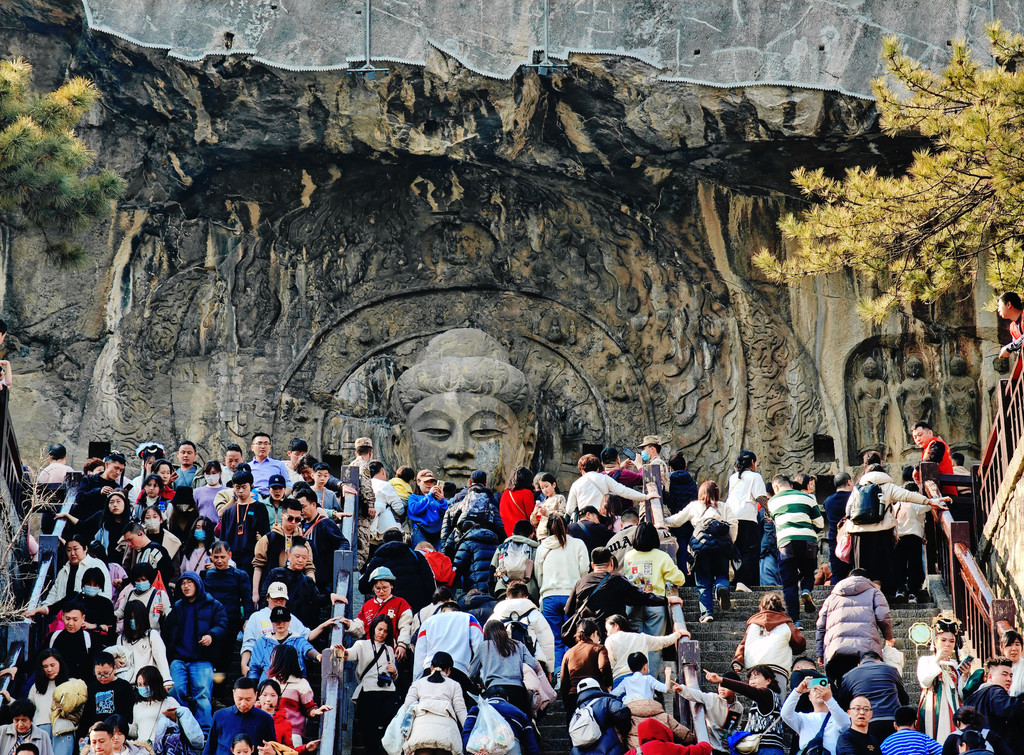 龙门石窟佛像前,看到千年前的工匠正附岩开凿不朽传奇。