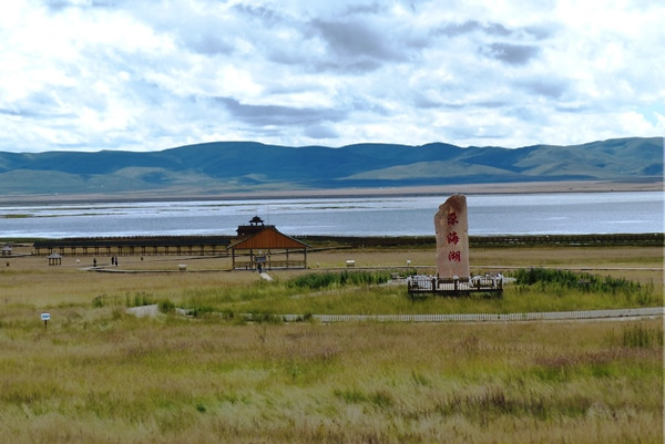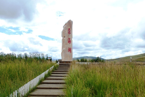 草原、湖泊、远山、阴云,“尕海湖”石碑矗立其中。