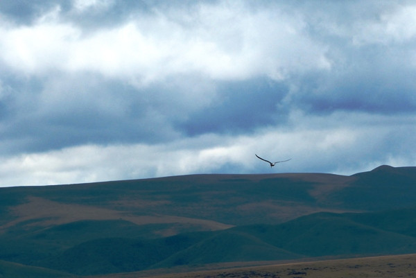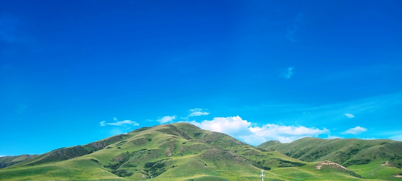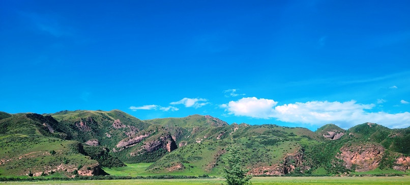 草原的天气变化多端,阴晴转换快速。蓝天,白云,黄、绿、红相间的多彩草地。