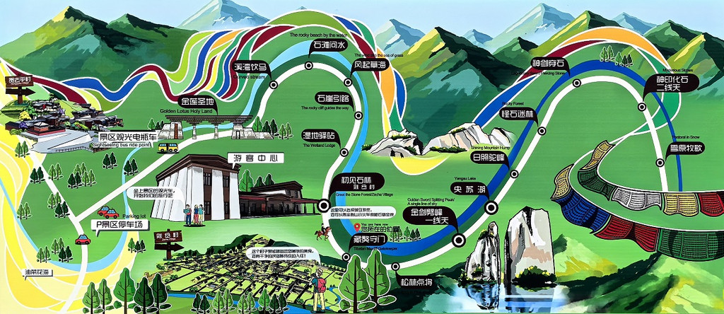 景区导览图中所示的很多设施(游客中心)和景点有的已建好,但未开放,有的尚在建设中。