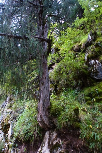 在石缝中顽强生长的松柏树,树根平铺扎根在石缝的泥土中,树干转90度向上生长。