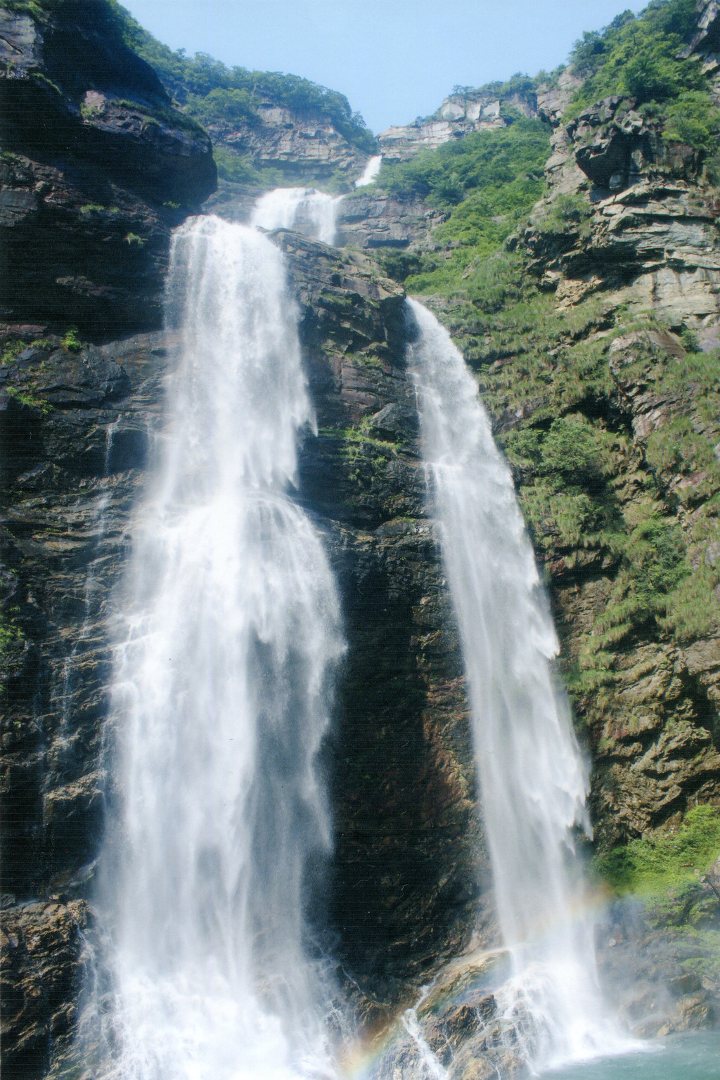 三叠泉瀑布古称匡庐瀑布,被誉为“庐山第一奇观”,三叠泉瀑布由大月山、五老峰的涧水汇合,从大月山流出,经过五老峰背,由北崖悬口注入大盘石上,又飞泻到二级大盘石,再喷洒至三级盘石,形成三叠,故名,总落差155米。