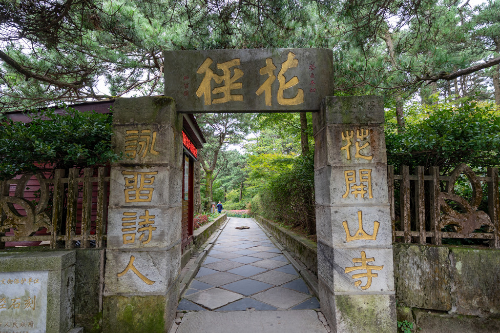 在湖畔,可以看到花径的大门。大门旁书“花径”,两旁刻有“花开山寺,咏留诗人”的对联。