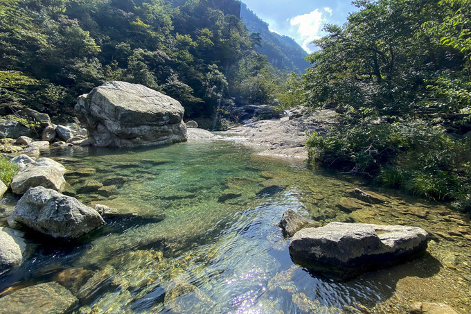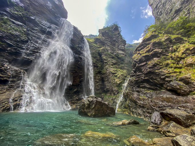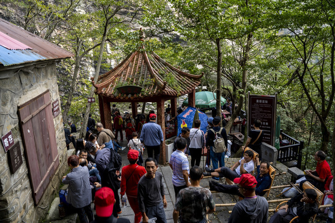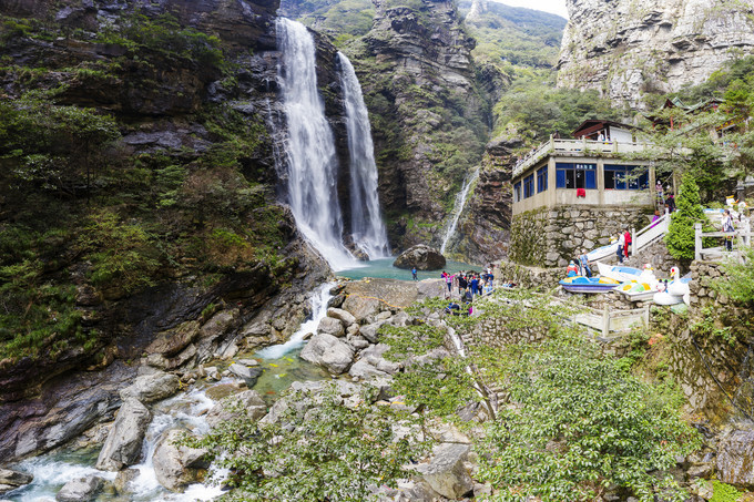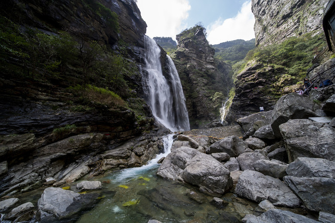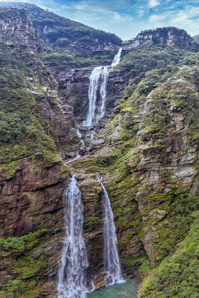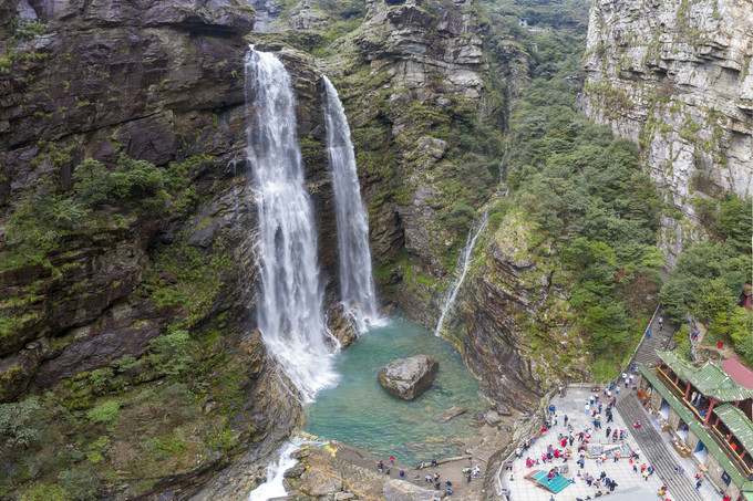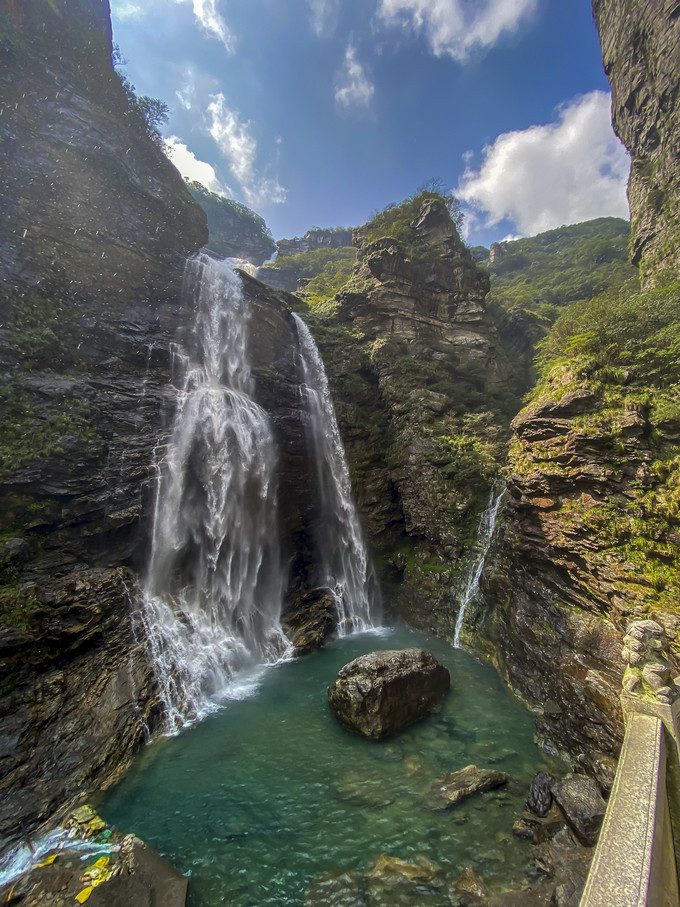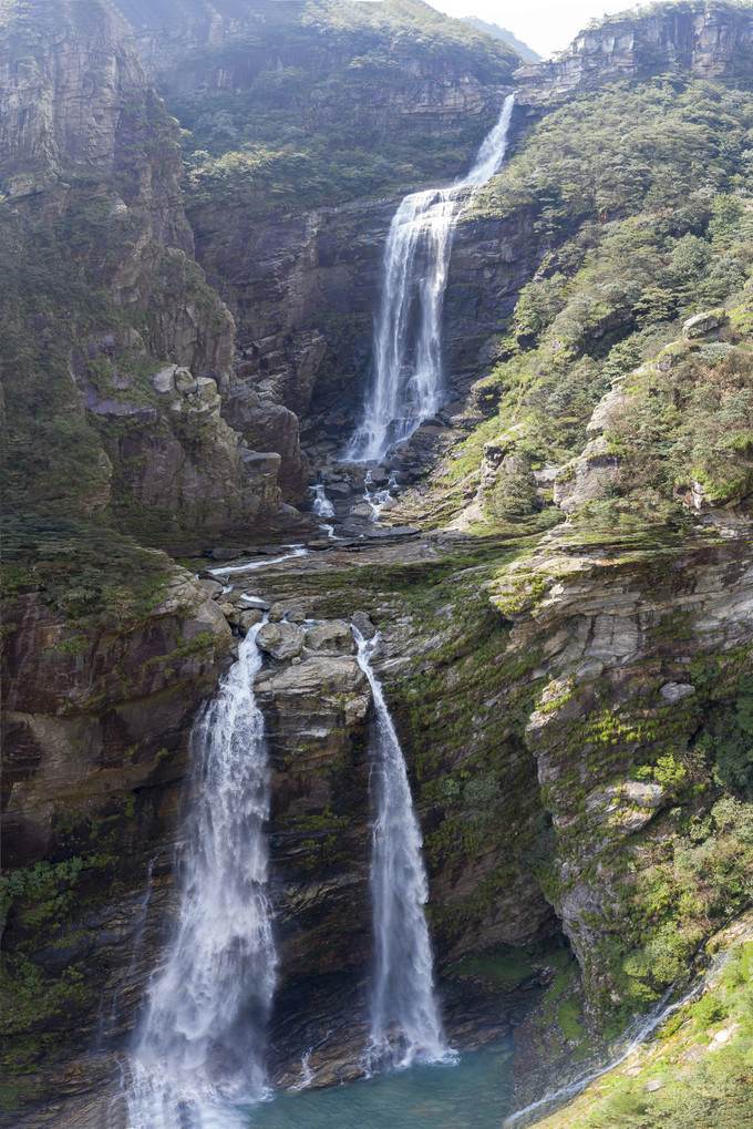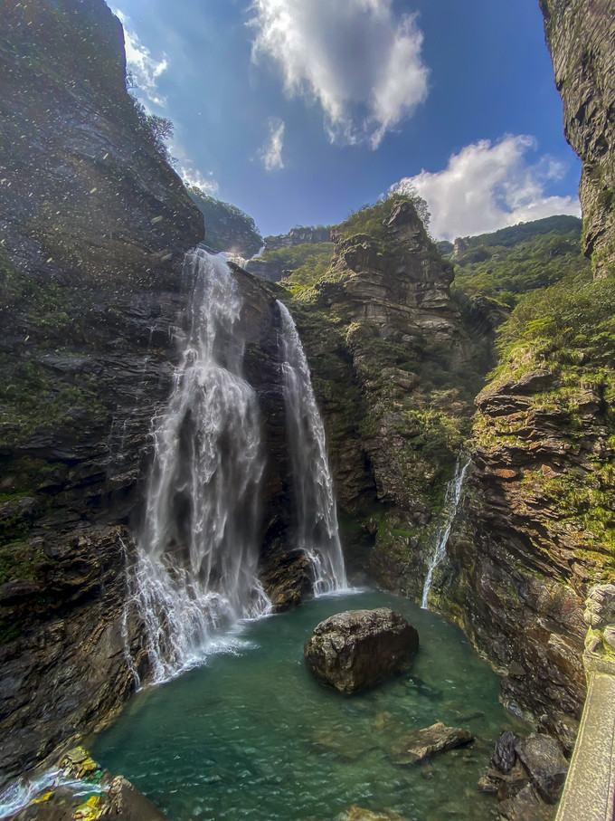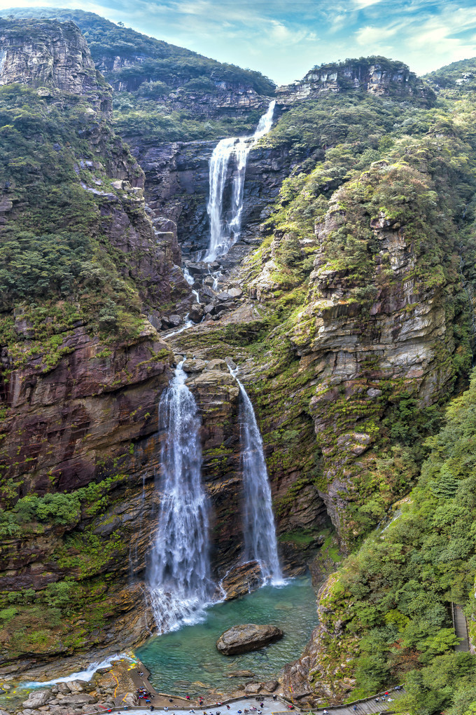 走下蜿蜒的台阶,峡谷幽深,瀑布溅起的水星伴着山里的雾气袭来,空气是如此清新,来到观瀑亭,可俯瞰三叠泉和峡谷全景,响若惊雷的瀑布声不时在耳边回响,三叠泉如九天飞洒般,在阳光的折射下,五光十色,瑰丽夺目。