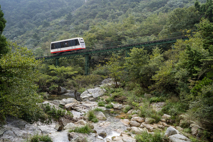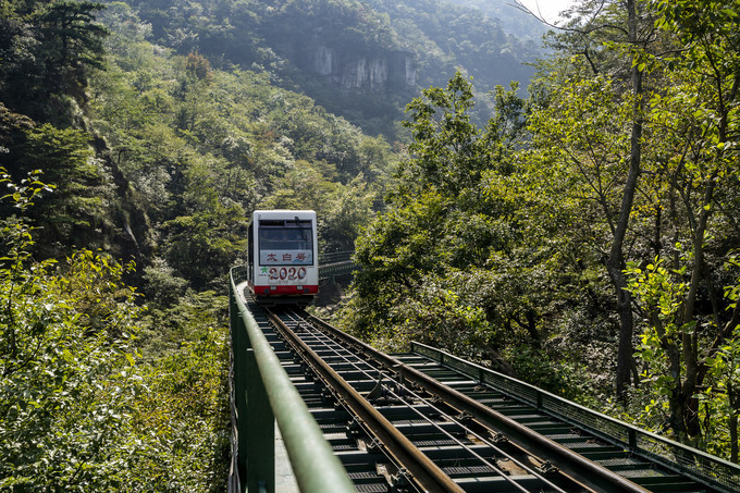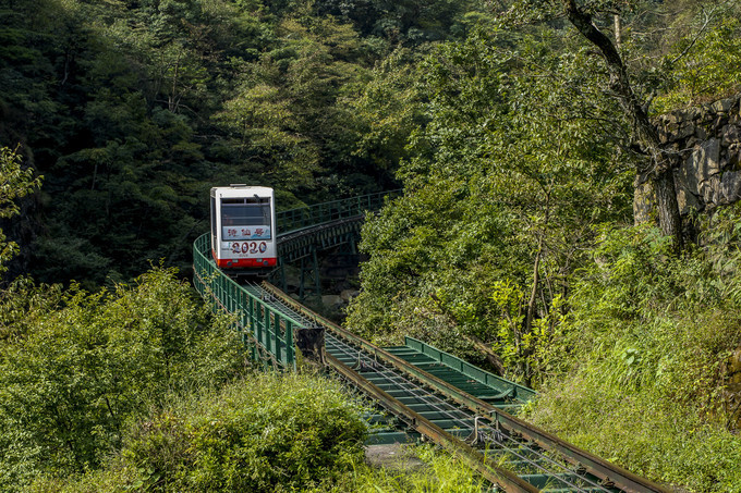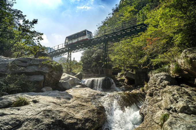 作为后来人我们比较幸运,不但能看到三叠泉,而且有缆车乘坐,三叠泉缆车全程依山而建,乘坐宽敞舒适的车厢顺轨而下,穿梭于山林之中,跨沟越溪,不仅观赏了美丽清雅的景色,更使原需花费45分钟的艰难步行变成了仅需5分钟的轻松之旅,既安全,又快捷,节省了大家大量的宝贵时间和体力。