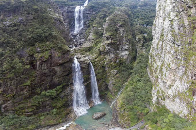飞瀑流经的峭壁有三级,溪水分三叠泉飞泻而下,落差共155米,极为壮观,撼人魂魄。三叠泉每叠各具特色。一叠直垂,水从20多米的巅萁背上一倾而下;二叠弯曲,直入潭中。“上级如飘雪拖练,中级如碎玉摧冰,下级如玉龙走潭。”站在第三叠抬头仰望,三叠泉抛珠溅玉,宛如白鹭千片,上下争飞;又如百副冰绡,抖腾长空,万斛明珠,九天飞洒。