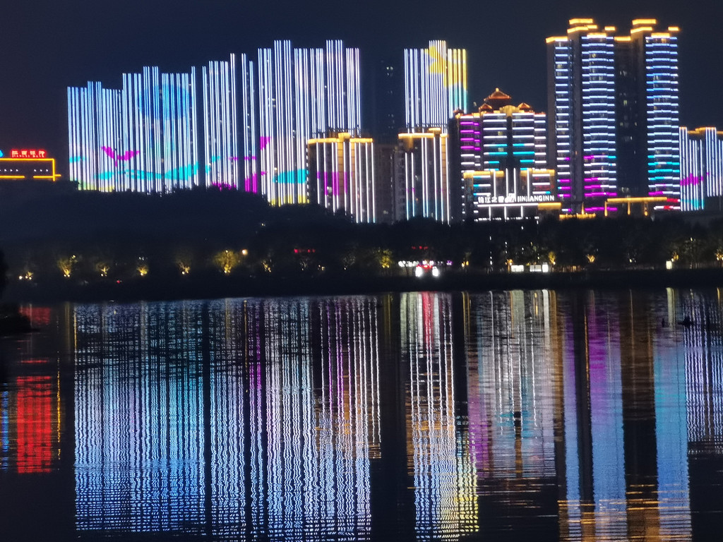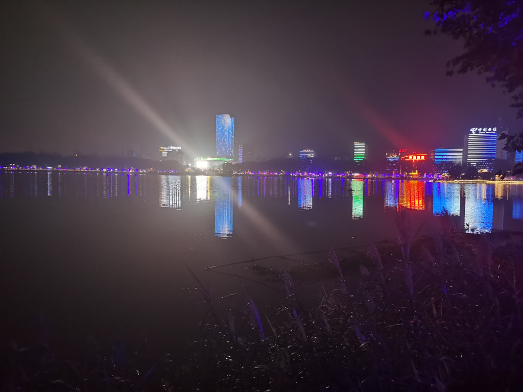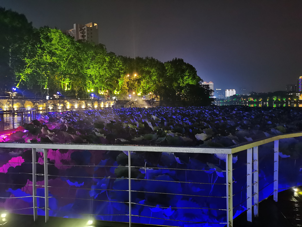 因为是晚上,风景是看不到了,只能看到各种炫目的灯光,那接天的莲叶,如果在夏日盛开,定是让人流连忘返的美景。一条李公堤把这处长江边上的内湖分割成甘棠湖和南湖,这里应该是九江市区最靓丽的风景了。九江这颗长江边上的明珠,在古代就是一处兵家要地,三国时期它属于孙权的地盘,吴国的水军就是在这湖里训练的,甘棠湖边有一个地方叫烟水亭,是周瑜的点将台,可惜晚上不对游人开放,只能无缘了。
