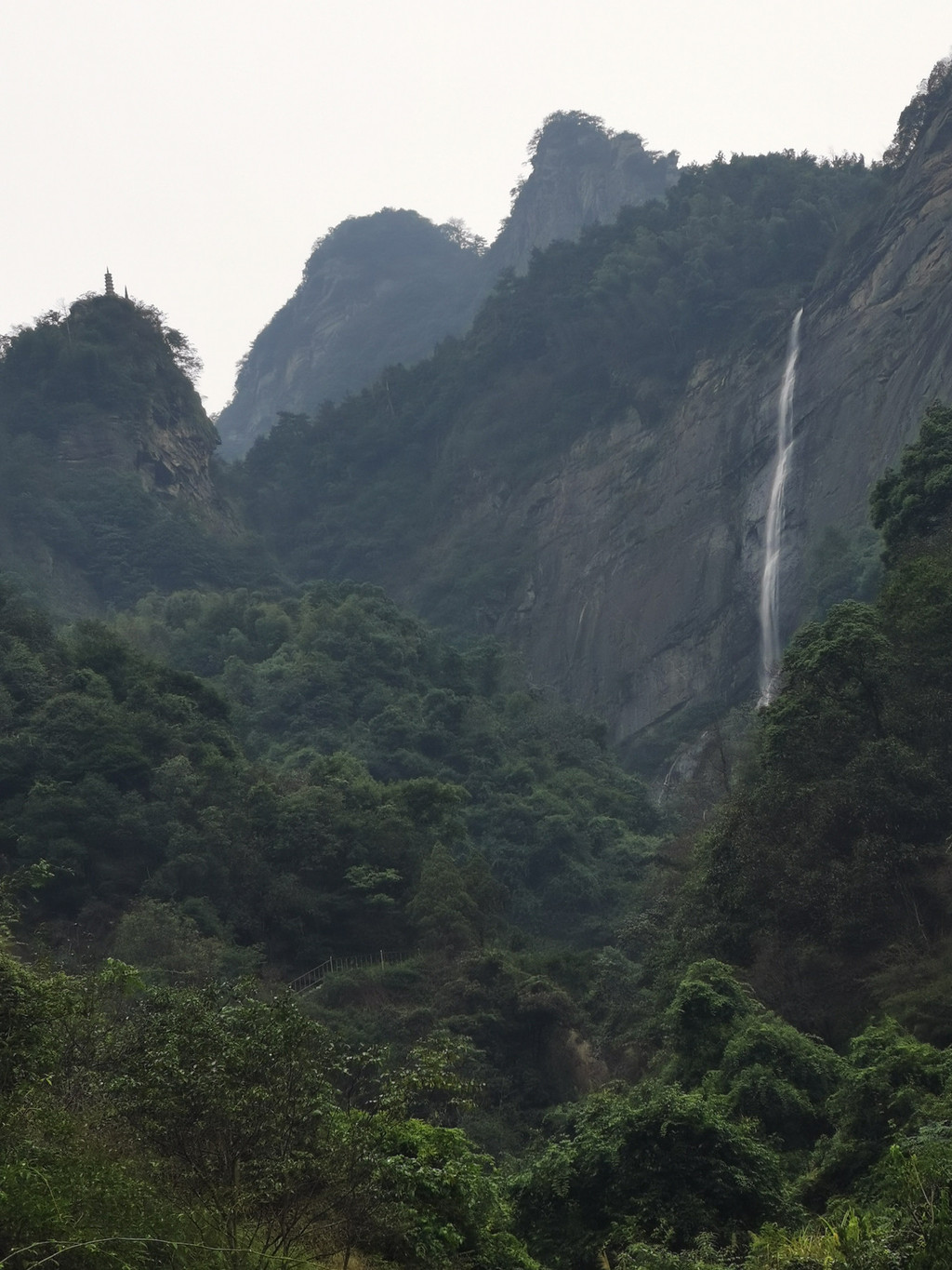 日照香炉生紫烟。。。导游不在身边,群山之中找不到哪座是香炉峰。这是瀑布正对面的文殊峰,我们的目的地,峰顶的塔叫文殊塔,在上面可以府视庐山瀑布全景。