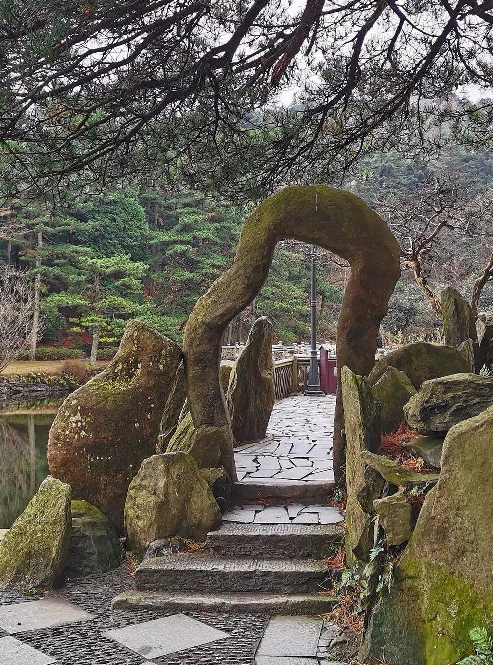 石上一株苍松名为“石松”,凌空展开两条树枝,如作拥抱状的手臂。其枝叶繁密,蓊郁盎然,根须裸露却能迎风挺立,千百年不倒,蔚为奇观。