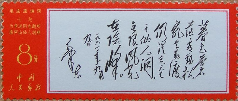 1961年李进(即江青)所摄“庐山仙人洞”照片就是从仙人洞前石护栏的角度取景,远望西北方锦绣峰,上方有蟾蜍石、古松疏影点缀,左下方为锦绣峰白鹿升仙台及御碑亭,境界开阔。这张照片备受毛泽东的称赞,并公开为之赋诗《七绝·为李进同志题所摄庐山仙人洞照》(图12):“暮色苍茫看劲松,乱云飞渡仍从容,天生一个仙人洞,无限风光在险峰。”文革期间这幅照片发表在《人民日报》和各种画报上,广为流传。在特殊的历史时期,仙人洞也从风景名胜挤入革命圣地邮票,成为邮坛传奇。踏着历史的足迹,从御碑亭下来不远就是仙人洞前的蟾蜍石,巨石上的石刻“纵览云飞”和“豁然贯通”被厚厚的积雪覆盖。水晶般的霜花挂满石松树枝,在阳光照耀下,银光闪闪,美丽动人!可惜锦绣谷已经封闭。远处山峦、怪石之上,茫茫一片,似雪非雪,仿佛披上一层晶莹的玉衣,光彩照人,在冬天灿烂的阳光下,分外晶莹剔透、闪烁生辉,蔚为奇观。