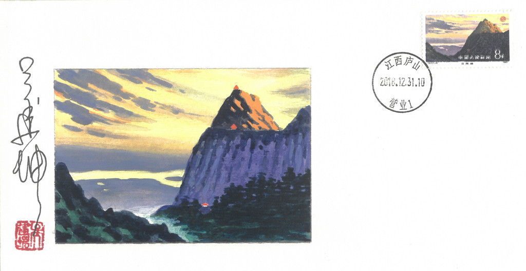 一直走到牯岭。赶在五点前找到邮局。在吴建坤老师的“日照峰”手绘封(图5),和李德福老师的“含鄱口”手绘封(图6)上盖上庐山邮戳。晚上就住在牯岭小镇。2018年的最后一天,我们在冰雪中徒步二十五公里。