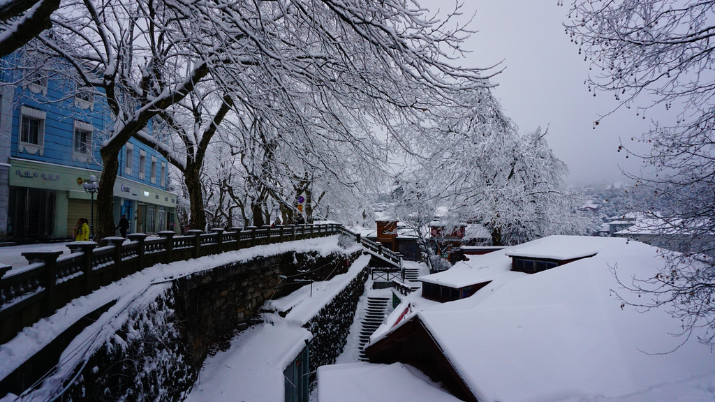美中不足的是,原计划“五老峰以及三叠泉”都因天气过于恶劣、道路陡峭难走而取消。于是早饭后,步行去仙人洞。在行进的路上,发现很多的店铺都是关闭状态,冬天的庐山是淡季。不过看着行人在不断的增加,估计是庐山的雪景吸引了不少像我们一样的游客,不远千里前往。