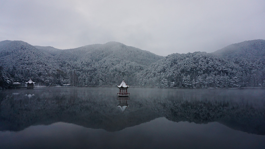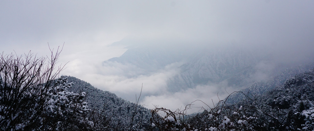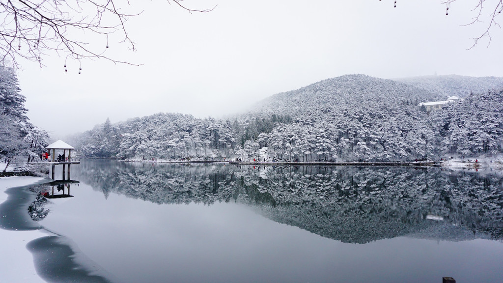 回来从白居易笔下的“人间四月芳菲尽”的“花径”走过,桃树披冰带甲,在冰雪中等待春天。沿着如琴湖另一侧回牯岭广场。当太阳被云层遮挡之后,山谷内云雾弥漫,而且越来越浓,山峰、湖泊慢慢消隐在白茫茫的山谷中。