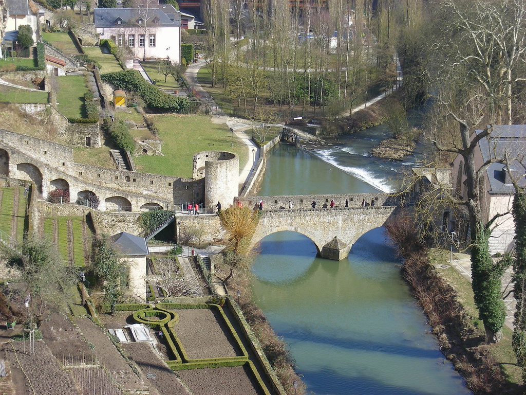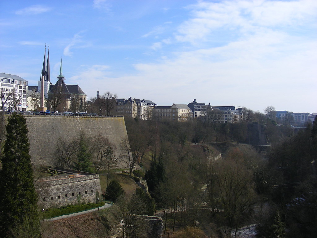 今天的卢森堡大公是荷兰王室拿骚家族的一个支脉,大公府邸和最高法院在卢森堡的上城,俯瞰蜿蜒曲折的河谷,上下落差极大而且坡度陡峭,在这个悬崖上还有巨石做成的工事遗址,中间几层平台变成了花园点缀着城市。
