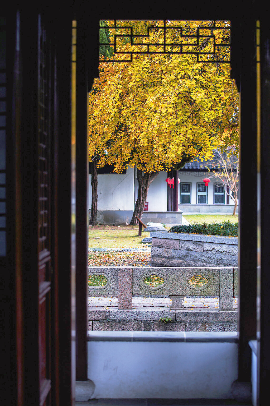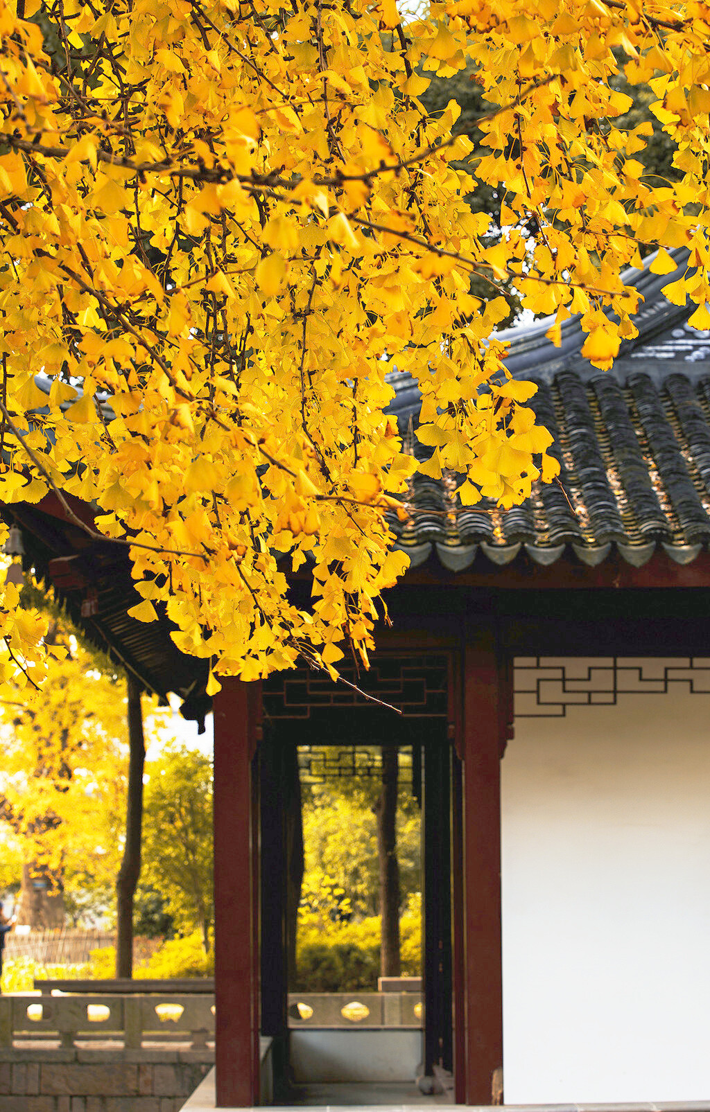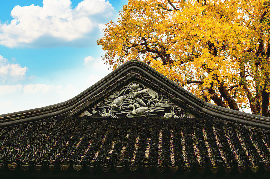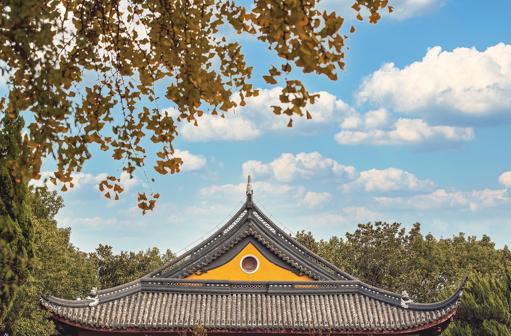 银杏树下的亭台楼阁,古巷旧瓦,飘落着几片银杏叶,美丽而又安静,构造着天与地之间的浪漫写意。