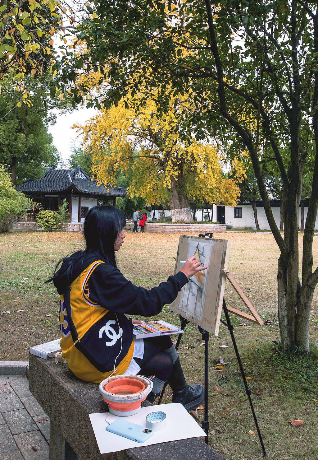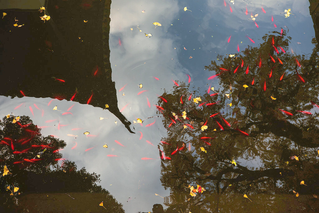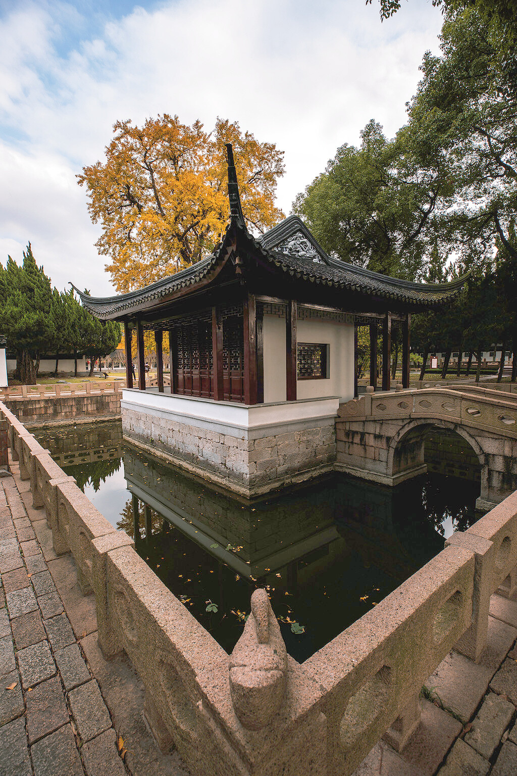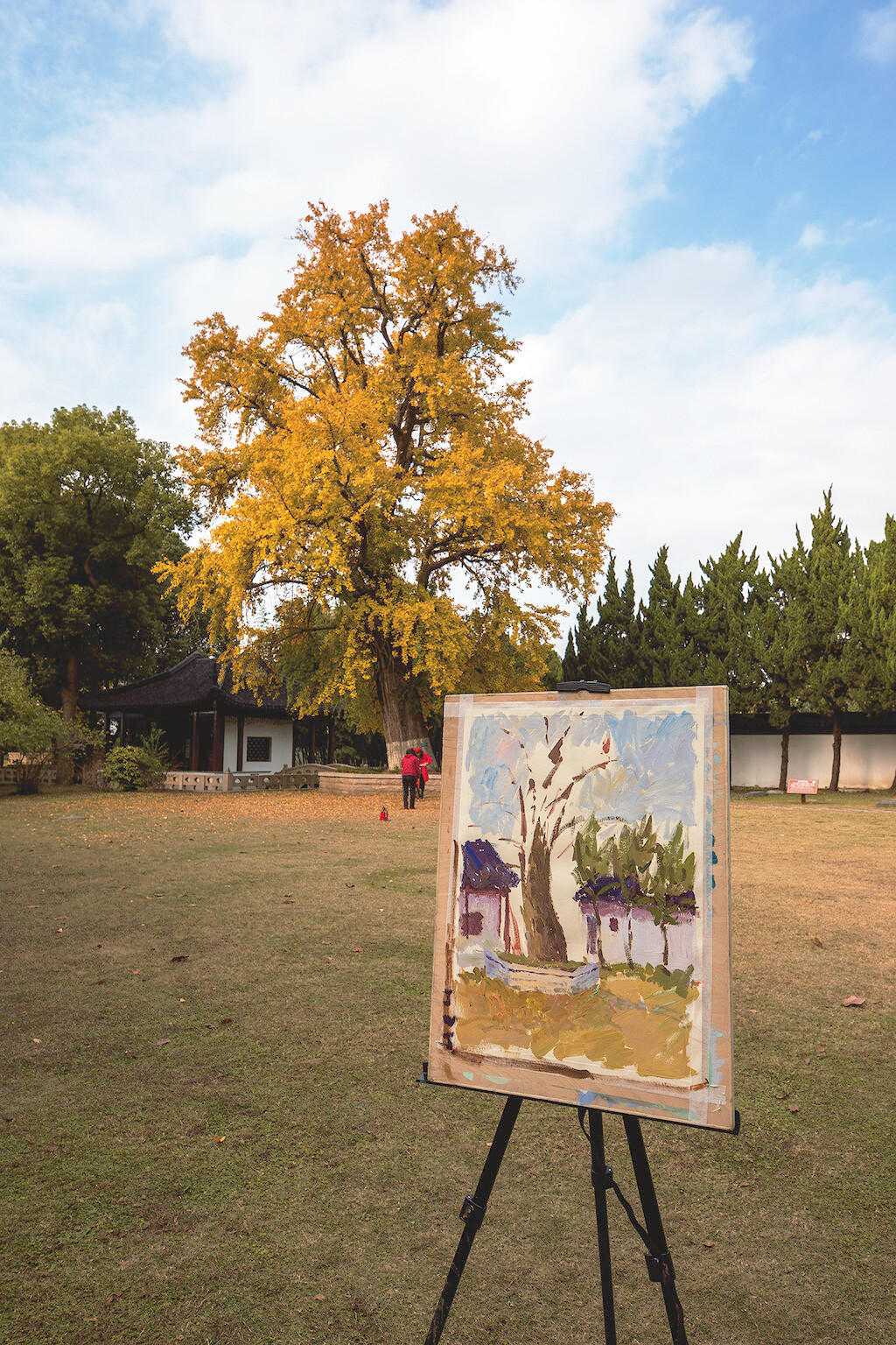 银杏树下的亭台楼阁,古巷旧瓦,飘落着几片银杏叶,美丽而又安静,构造着天与地之间的浪漫写意。