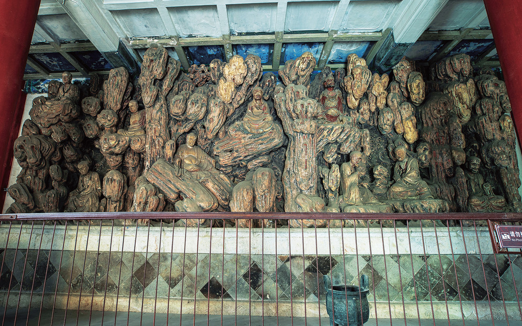 现仅存的“半堂”罗汉,以连绵层叠的山石为背景,九尊罗汉或于石壁前对坐谈禅,或于山洞内泰然打坐,或于波涛中弯腰俯视,人物景致栩栩如生。