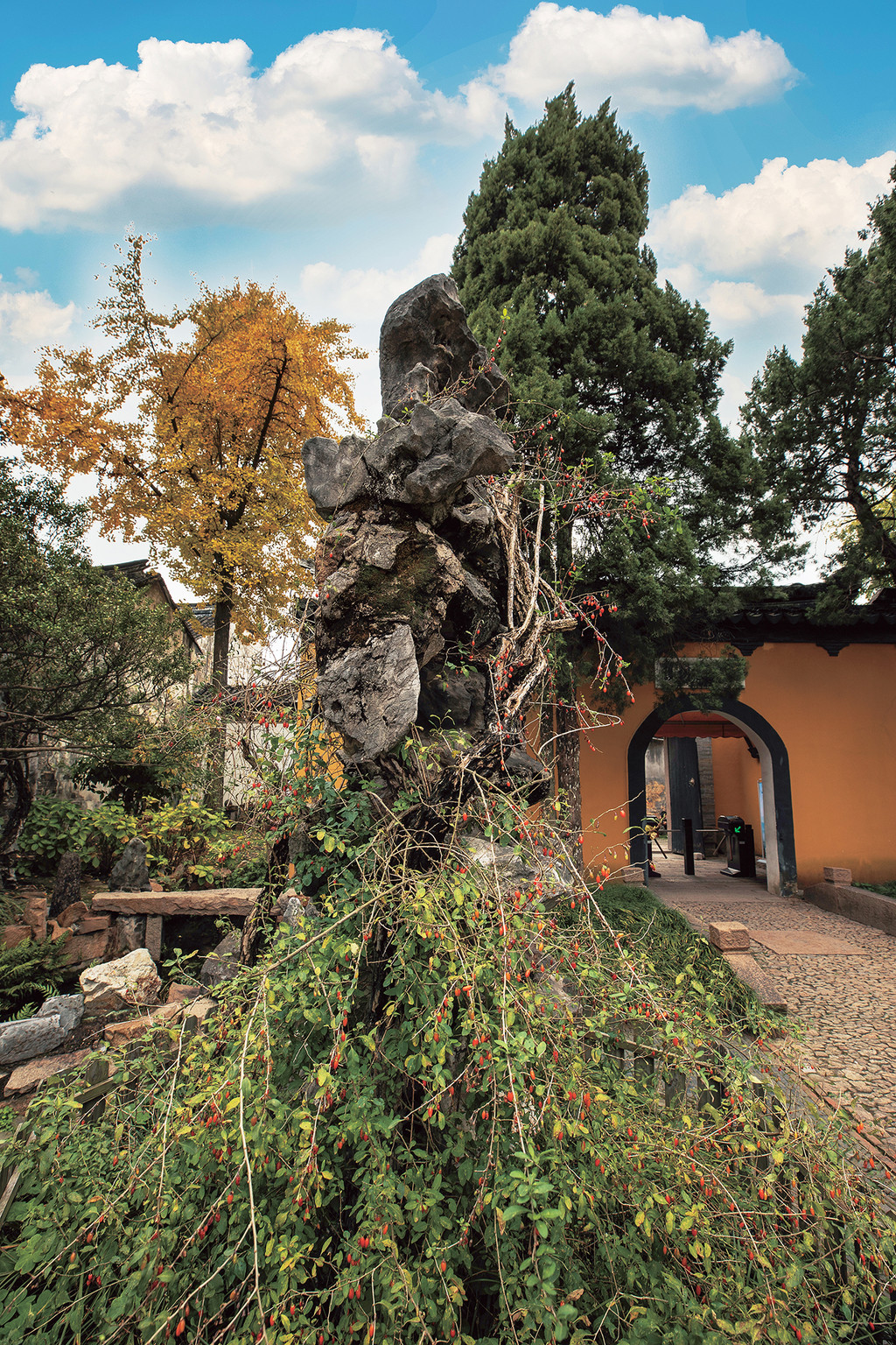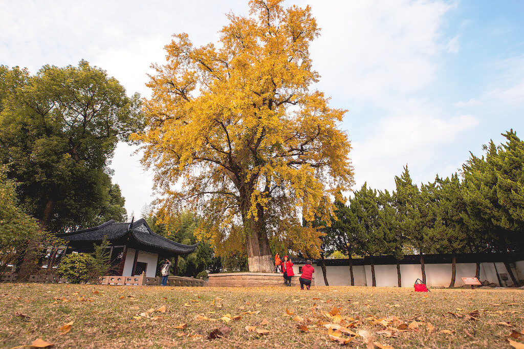 甪直古镇有4株千年银杏,栽种在保圣寺内,株株树冠华茂,每年银杏一黄,抬眼望,满目金黄,一点一滴揉碎在枝叶阑珊里。