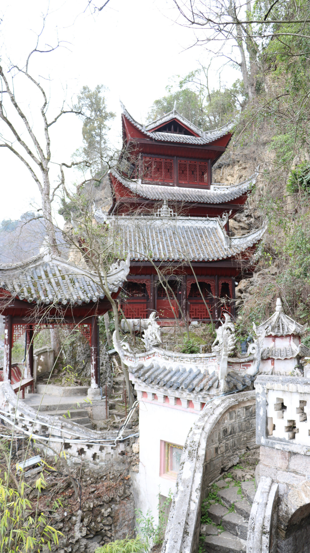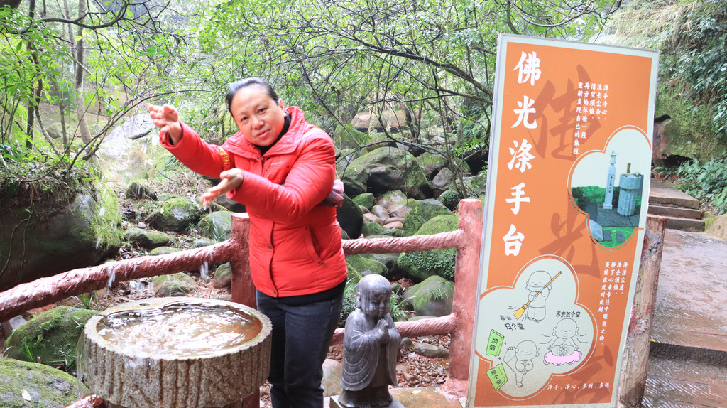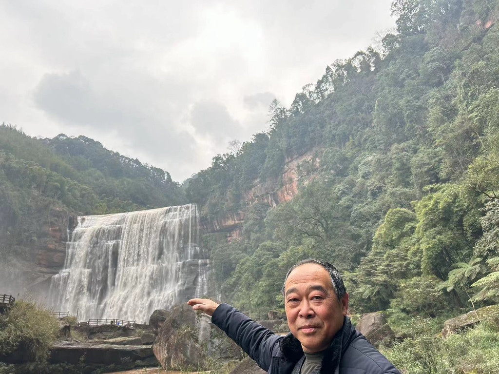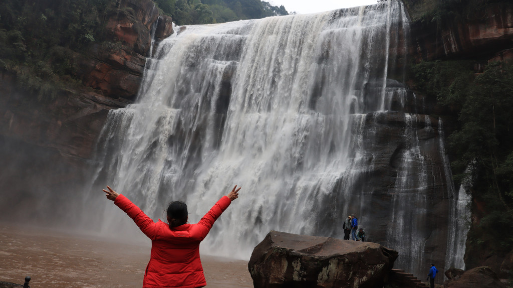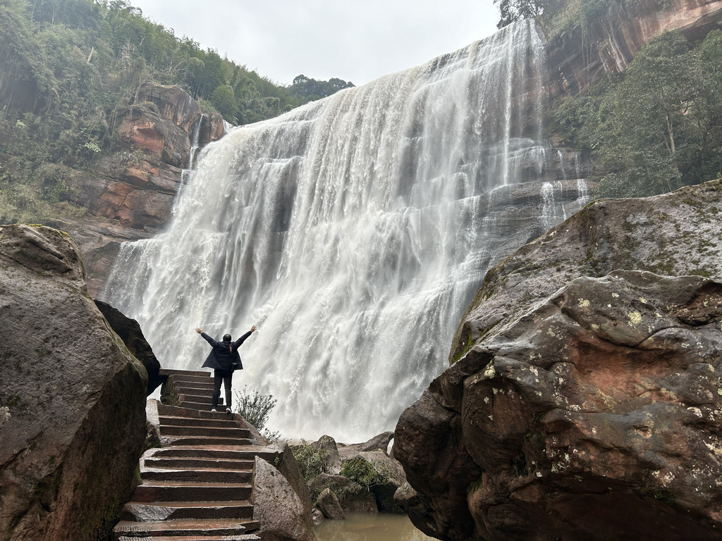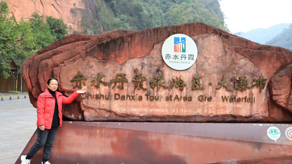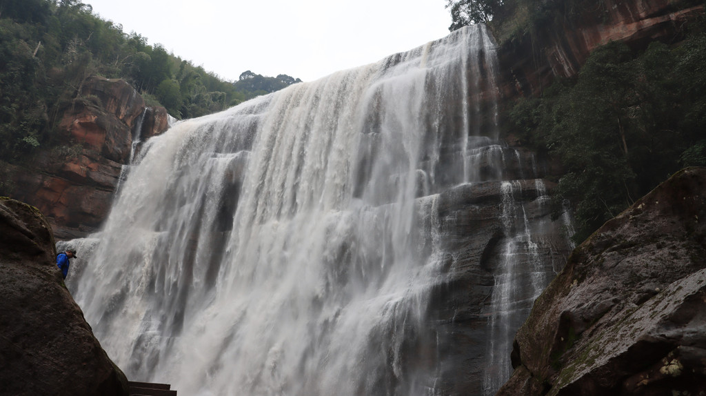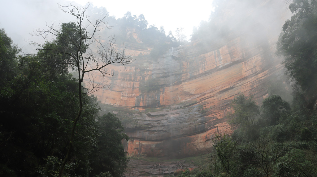 赤水丹霞旅游区佛光岩景区是比较经典的景区,但是天气原因,雾大瀑布小,游客少。