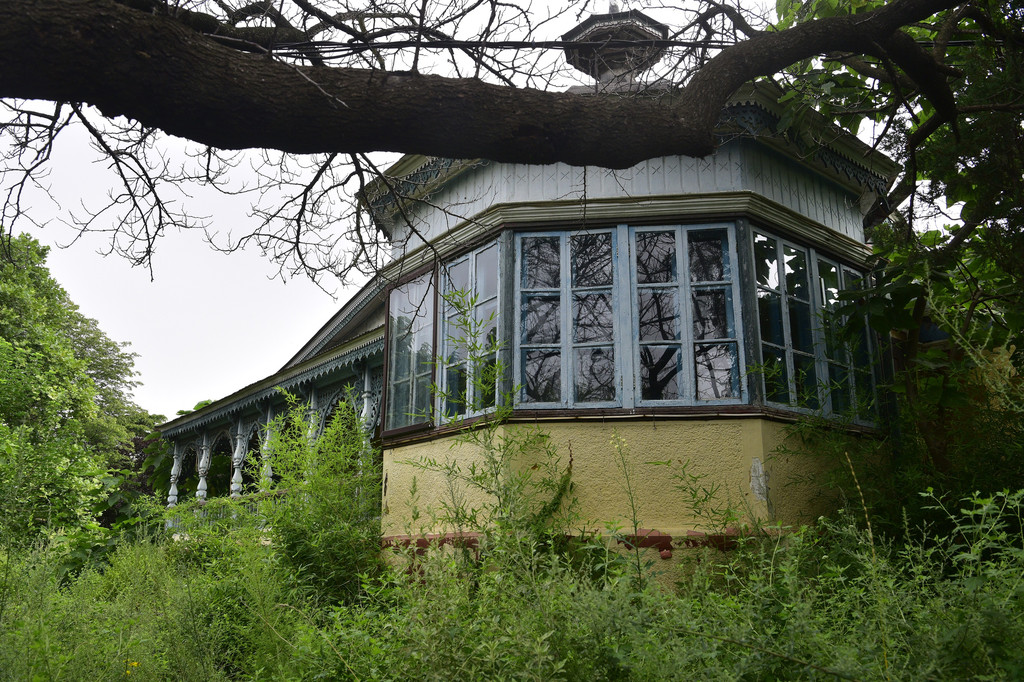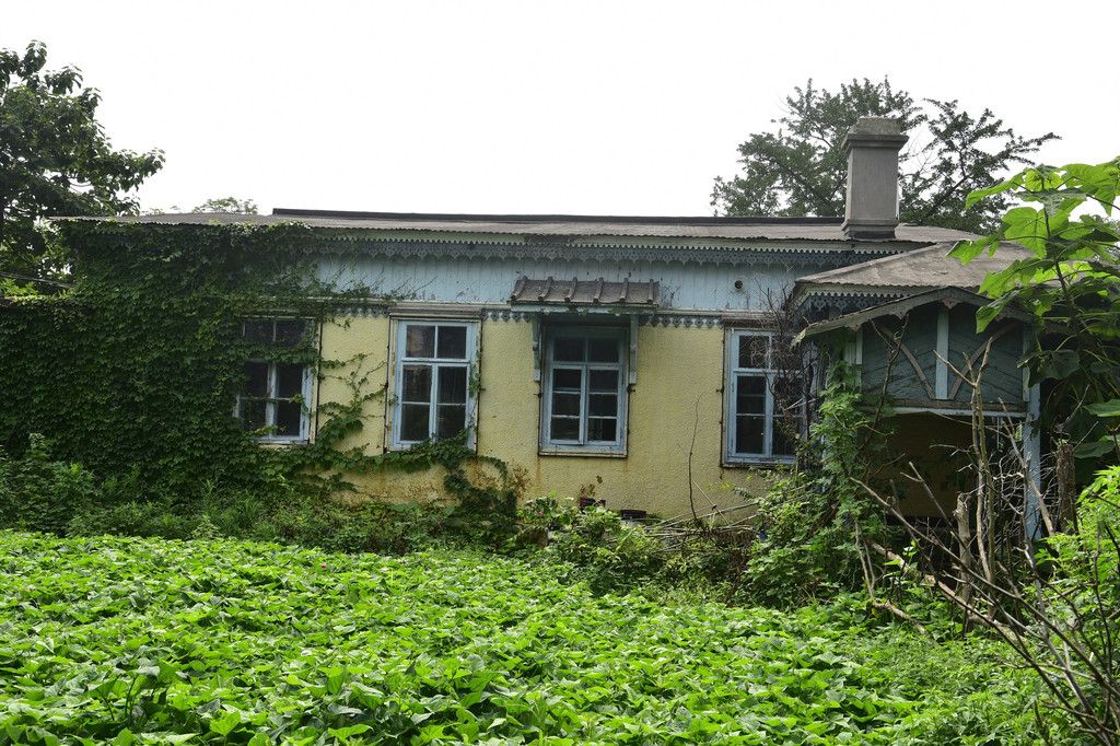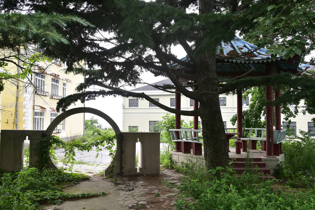 后来从围蔽的铁门空隙处进入到围蔽里面,该处是一个小山头,上面建了几栋四五层高的别墅,前面建了一个六角亭,坐在亭子里面喝茶望海,可是十分惬意。感觉这些建筑都是后来人搞的,溥仪那个时候应该没有,因为完全没有帝王之气,四周都是一片番薯苗、小黄瓜的菜园子。其实在溥仪楼靠海的地方还有一个亭子,和一般居民社区的休闲亭一样,可以坐在里面打牌下棋,但是现在完全荒废杂草丛生,据说曾经是军队疗养院,现在已经完全废弃。在婉容楼里面透过玻璃还看到有一张台球桌,但肯定不是皇后玩过的台球桌。