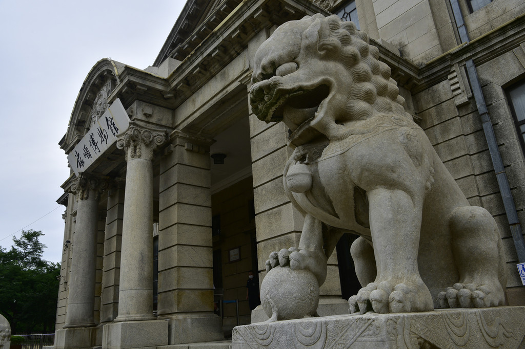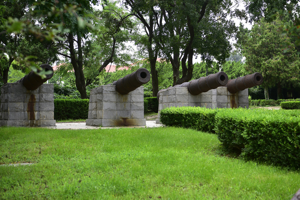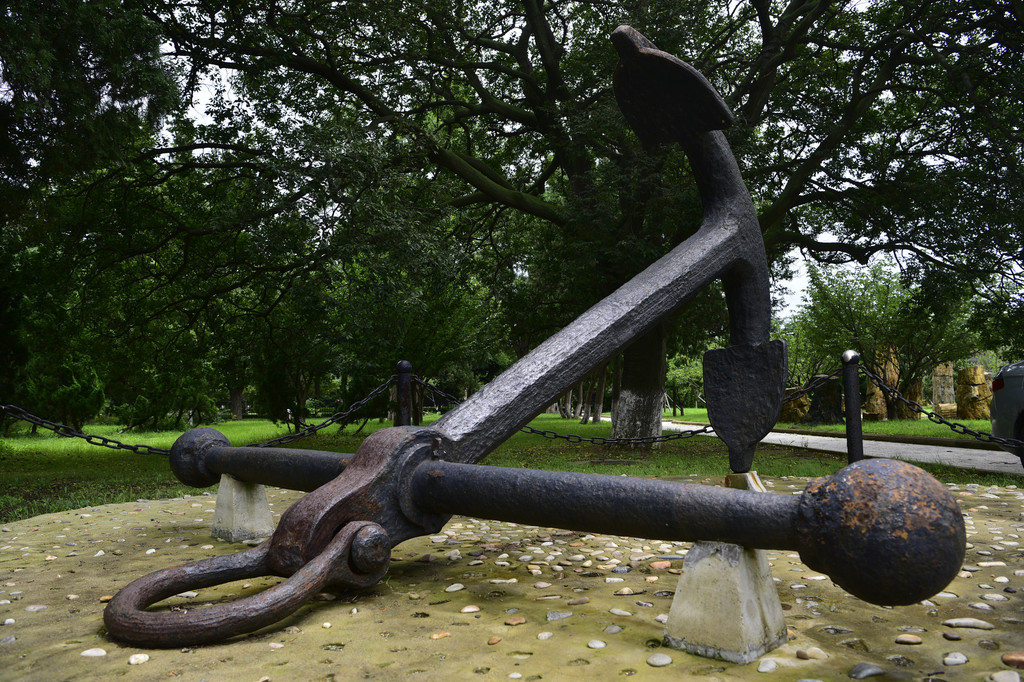 走出博物馆分馆的出口,千万不要立即就走出了铁栏杆围起来的大门,最让人惊喜的是博物馆把室外后面的草坪作为露天展台,一片树荫下有4门古炮,还有石磨、桥墩等等,草坪的一角展示着一个日俄战争期间被击沉的俄国军舰大铁锚,像一把老石匠用坏了的黑色铁锹,1.5吨的黑铁钩狰狞地暗示人们不要忘记那段不堪回首的烽火岁月。