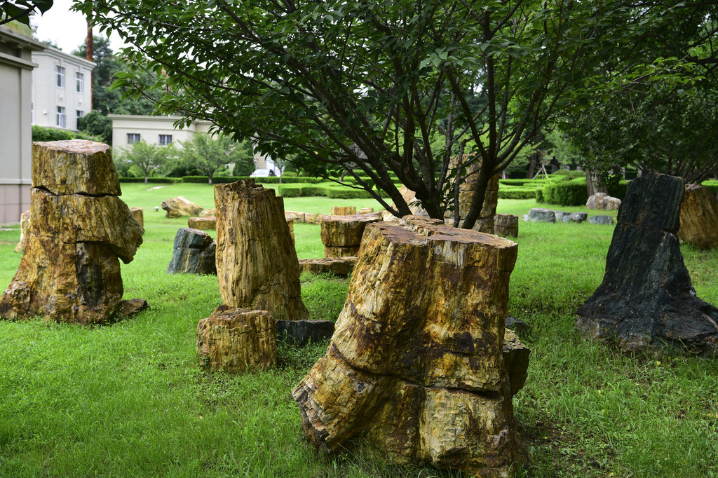 最让人喜出望外的是许多硅化木化石高高低低散落在绿色的草地上,有的刻意摆成了石凳石桌,有的好像布展工人刚刚把这些数以吨计的圆柱体宝贝搬回来还没来得及收拾,暂时杂乱无章地随意摆放在草地上,正是这种无意而为的展示,给人一种满目青翠的舒展与呼吸,你可以在清幽的草地上坐一坐,触摸一下深山老林经过亿万年深度掩埋坐化而成的冰冷的宝石,畅快地呼吸旅顺口风云激荡了百年的清冽海风。