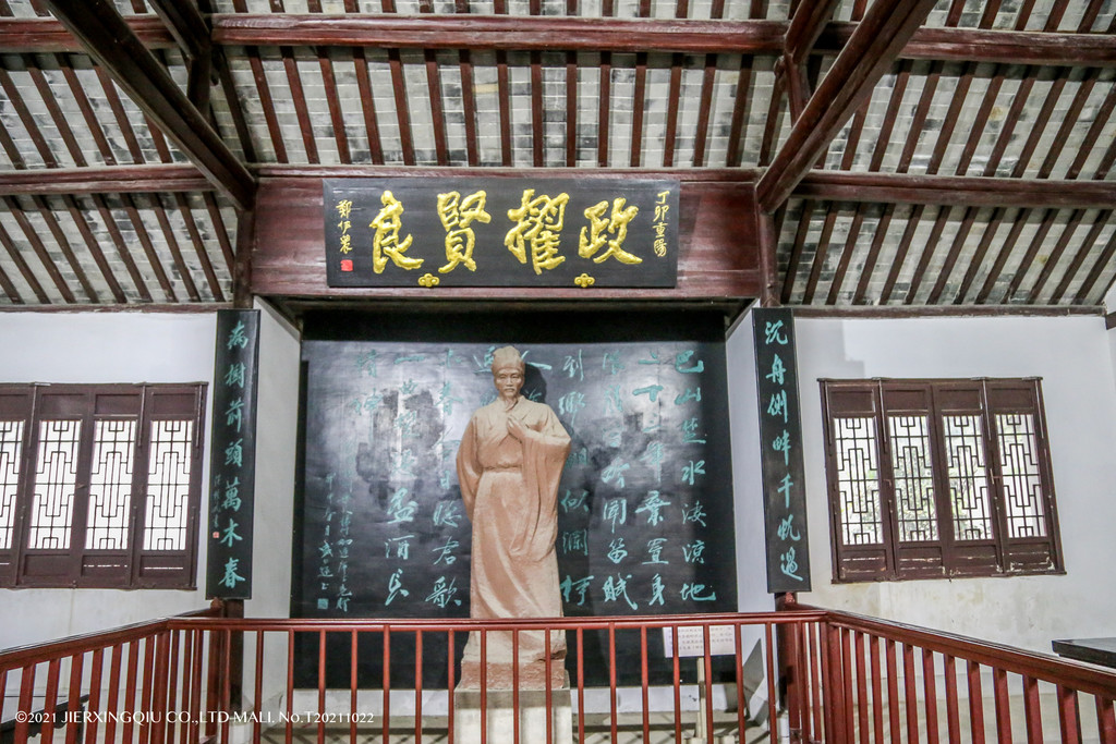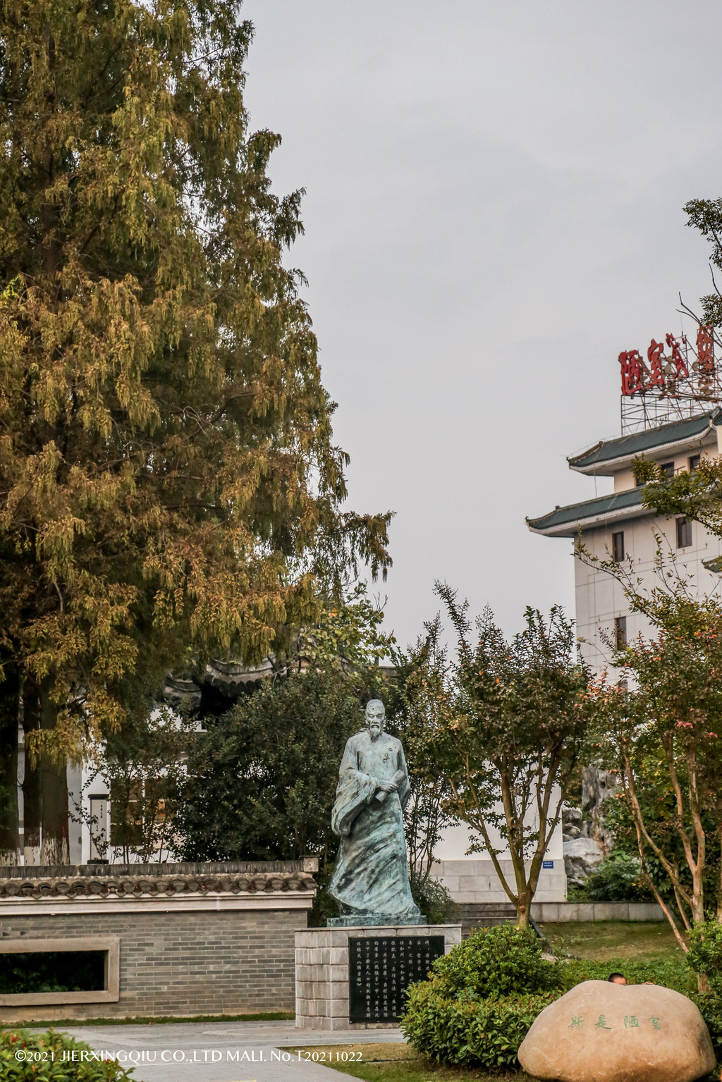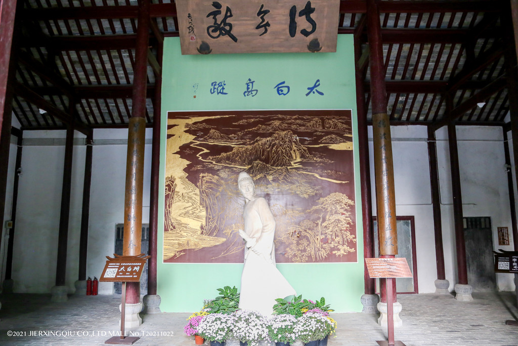 太白祠正庭迎面耸立着一尊汉白玉李白塑像,塑像侧身而立,左手按剑,右手后垂,双眸含慧,胡须飘逸,再现了诗人气度非凡的形象。