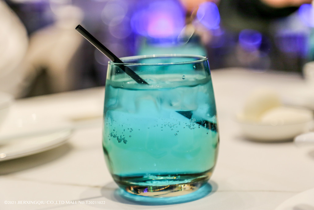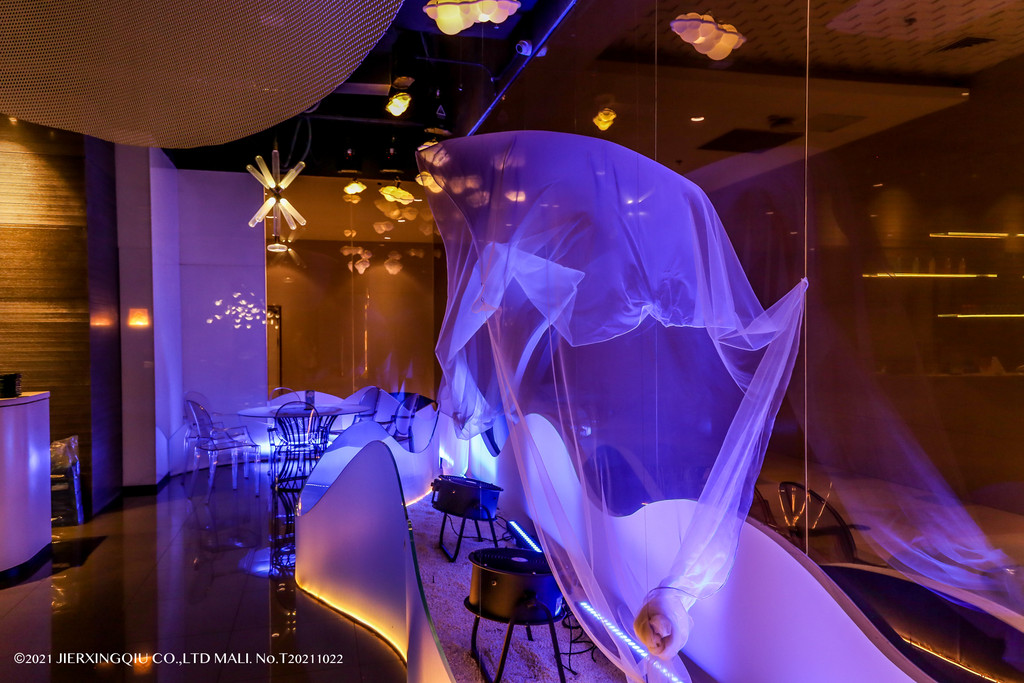 穿过玻璃珠帘的前厅,进入后仿佛就和这尘世隔离,来到一片梦幻蓝的绝美之地。整个餐厅都铺满那梦幻的蓝色,墙上的轻纱随着风轻轻摇曳,花朵一般的灯上下纷飞,美轮美奂。