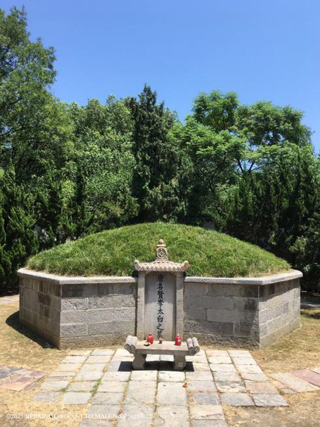 后面是诗仙太白的墓地,呈圆形,青石砌边。由170多块青石环形垒砌,墓顶芳草萋萋。