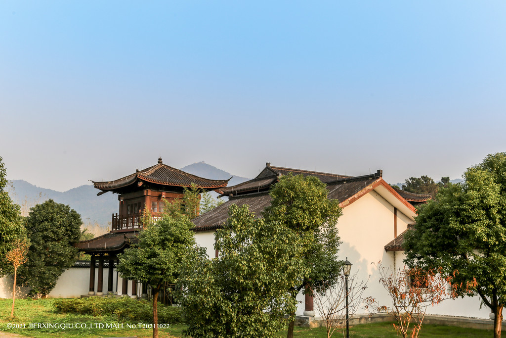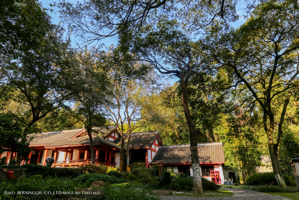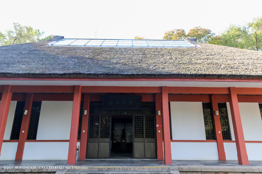 整体设计为园林风格,庭院里主馆、副馆和学术馆三个以茅草为顶。