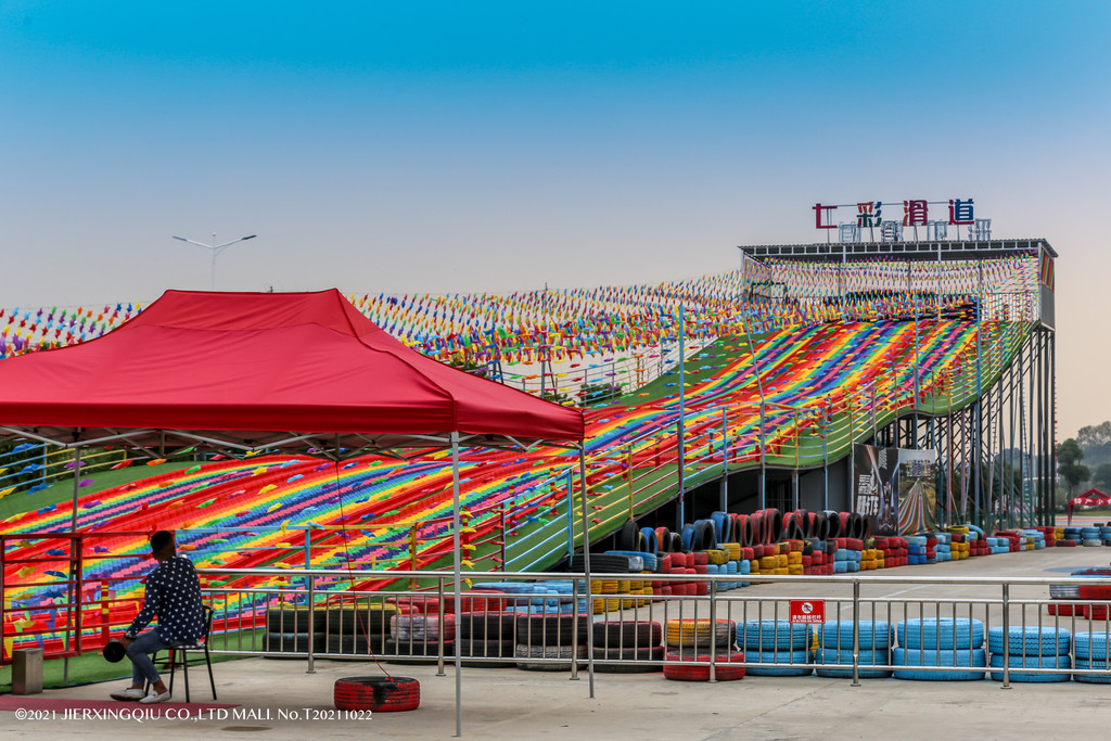 滑道是由五彩斑斓色彩铺设而成的彩虹旱滑跑道,高达十几米,长度百米,远远眺望好似一道彩虹卧于美丽的青山中,浪漫而又美丽。