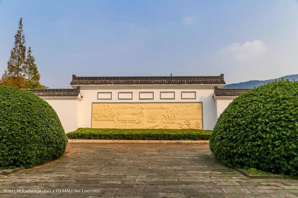 进入园门,迎面是一堵黑瓦白墙的照壁,中间刻画一幅大型浮雕,画面是李白《望天门山》的诗境:天门中断楚江开,碧水东流至此回。两岸青山相对出,孤帆一片日边来。
