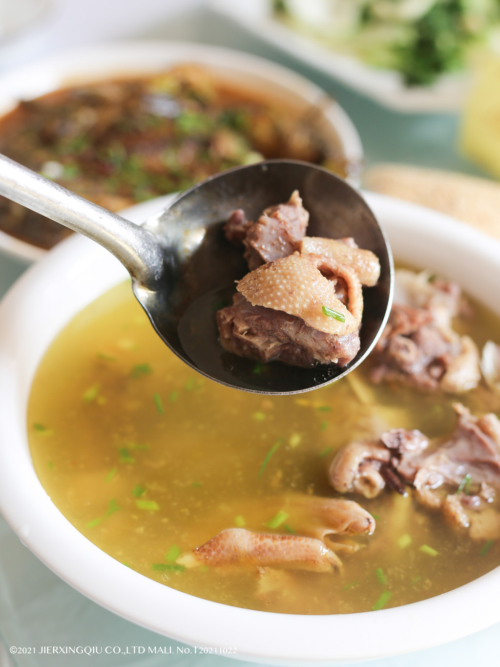 老鹅汤是用当地农民自然放养的成年白鹅,现食现杀,加入盐、生姜、冰糖、料酒、香葱等多种配料,用文火炖烂。其特色是汤色清亮,肉烂而不碎,汤汁油而不腻,味道鲜美,汤味醇厚,食后回味无穷。用老鹅汤泡锅巴、炒米又香又脆,更是一绝。