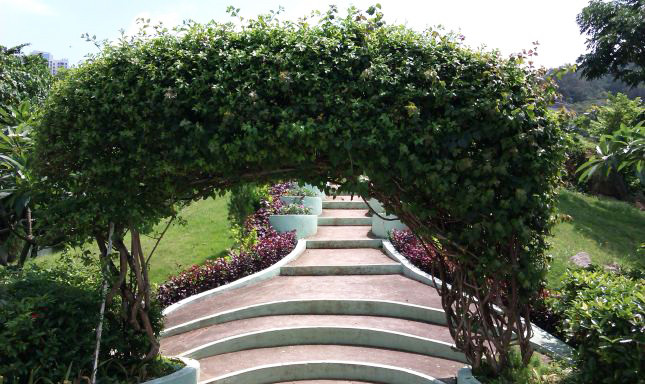 圆形荫棚上种植了花多色艳的藤本植物如杜鹃、珊瑚藤及金银花等,非常美观,一定一定要记得拍照!