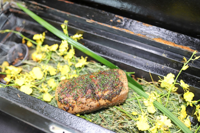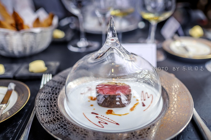 第二道“香烤牛柳及鸭肝配砵酒汁”,上菜时,两名侍应生会将长方形精美的木盒子托到你面前,打开时里面会散发出一种浓浓的熏香味,迷迭香和干木枝低温炙烤后的牛柳和鸭肝放在中间。