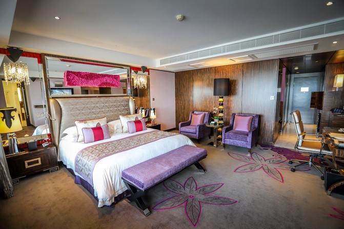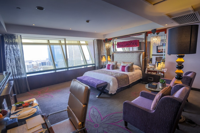 酒店共有超过 400 间气派豪华的 客房及套房,房间色调有三种,红色、蓝色和紫色,我住的房间为紫色。