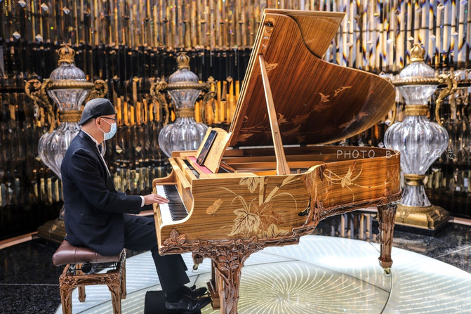 施华洛世奇水晶吊灯底下,安排了钢琴师演奏,我们过去拍照时,琴师还会用眼神来配合你留影。