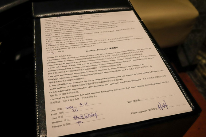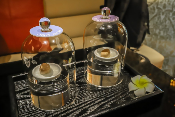 体验的是60分钟新葡京皇牌按摩护理,有10几种香熏可以选择,按摩师会将香熏石盖在玻璃上,给我们闻,方便挑选。香熏都是英国生产的。