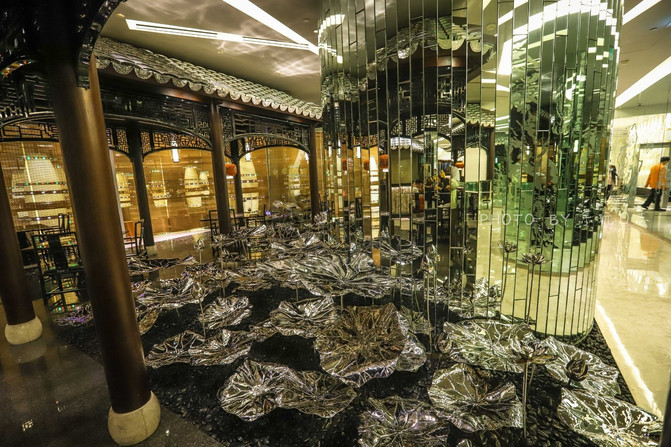 餐桌旁边都是荷花池,而荷叶是金属制作的喔。