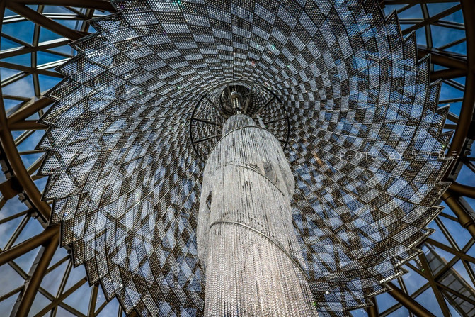 餐厅正中央悬挂着一盏由 131,500 颗施华洛世奇水晶镶嵌的特大水晶吊灯,犹如瀑布般从 19 米高的圆顶天花板倾泻而下,在云石地板的映衬下,再配合上两旁的 Baccarat(巴卡拉)水晶落地灯,超浪漫。