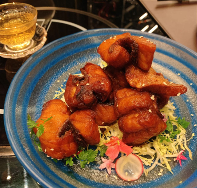 蜜汁果木烟熏鱼,外皮酥脆,能闻到烟熏味和果木香气,肉质鲜嫩。