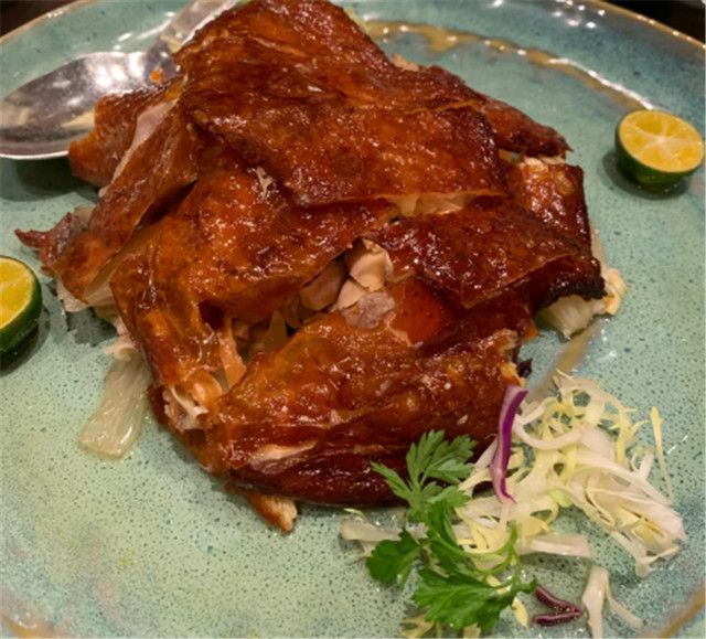 接下来给大家推荐的一些菜品,受到了我和朋友的一直好评,大家可以放心来get同款菜单哦。首先是柚子脆皮手撕鸡,嫩滑的鸡肉被隐藏在酥皮的外皮之下,清新的柚子加上特制的酱汁,这种做法的鸡肉让人越吃越上瘾。