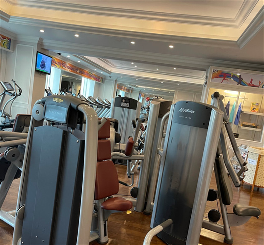 室内健身房的运动器械真不错,拉、推、举、踩、跳,身体的各个部分都能锻炼到,还有专业的健身教练会在一旁指导你哦,不花钱就能享受到的Vip待遇~