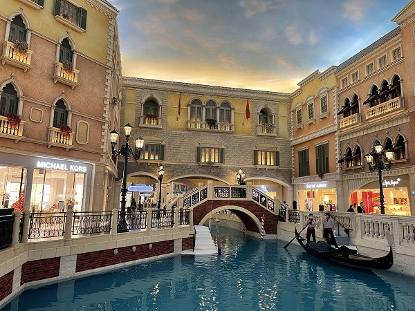 威尼斯人购物中心是一个仿威尼斯建设的室内购物中心,购物中心的顶部用巨幕投射出了蓝天白云的景象,其他的建筑物都是完全复刻威尼斯的建筑,室内设了一条运河,并架设了很多座小桥,景观很特别。