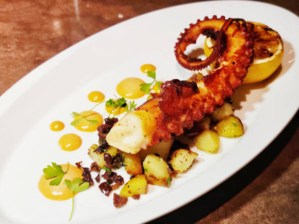 好吃的章鱼是来自意大利的,触手上的吸盘有两排,只有一排吸盘的,口感没有意大利沿岸生长的章鱼好吃。而这份章鱼就是有两排吸盘的,而且烹调得宜,口感软糯,搭配土豆的香味和伴吃的酱汁,好吃。